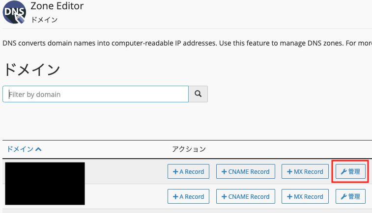 僕はmixhostで運営していたので、コントロールパネルにログインして→「Zone Editor」→「管理」ページにアクセスします。