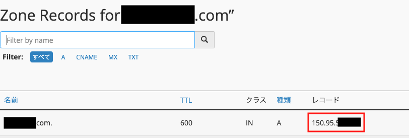 Aレコードに表示されているのがそのブログ(が稼働しているサーバーの)IPアドレスです。