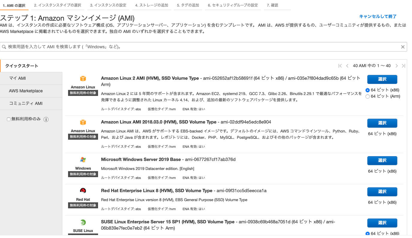 Amazon Linux 2 AMI (HVM), SSD Volume Typeを選択する