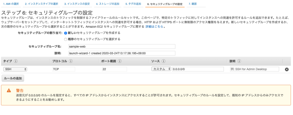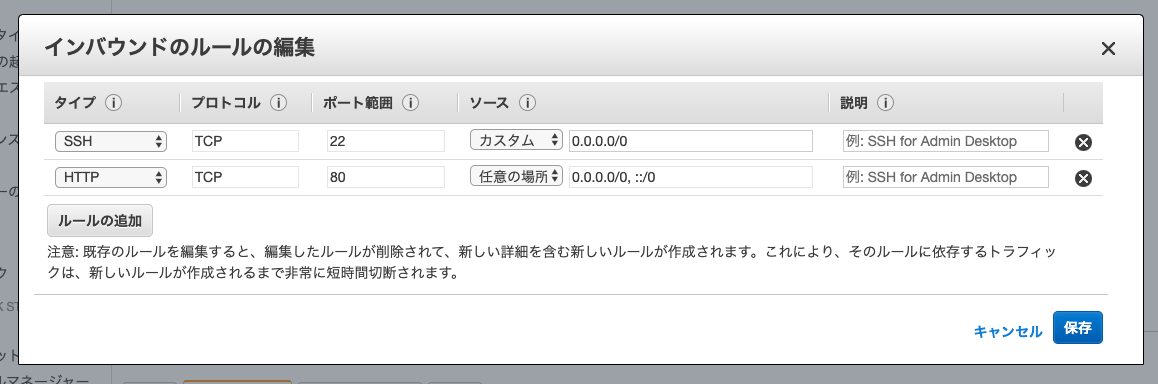 デフォルトはSSH接続の22番ポートしか開いておらず、HTTPアクセスが出来ないので80番ポートを開放します。