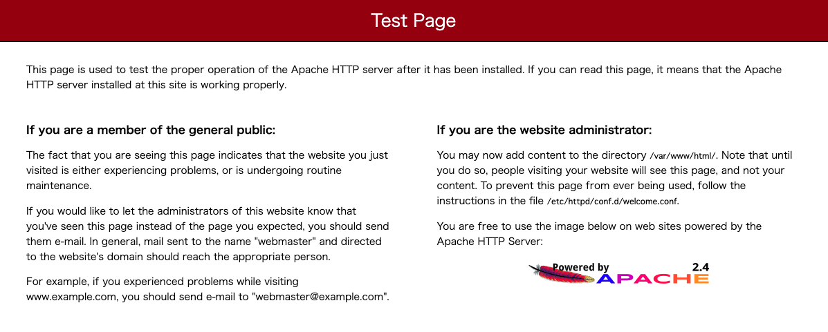 - パブリックIPアドレスにブラウザでアクセスすると、Apacheの初期ページが表示されます。