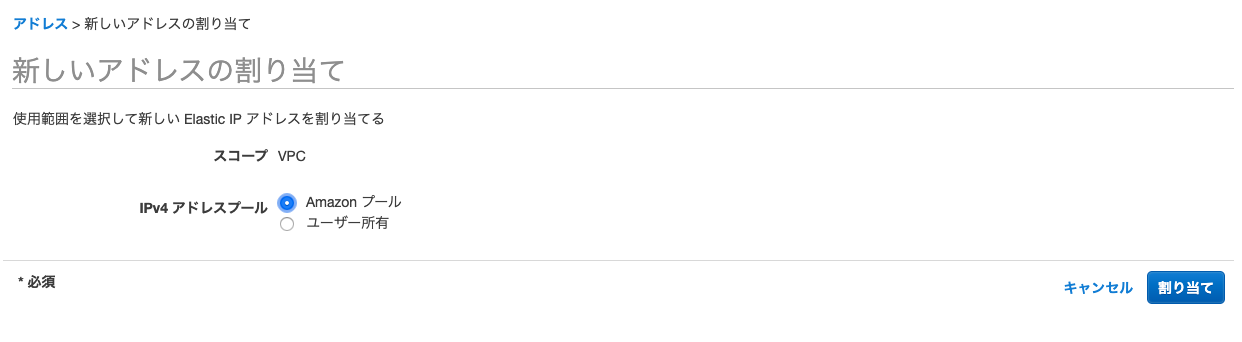 - EC2ダッシュボードのElastic IPから新しいアドレスの割り当てページを開き割り当てを実行する