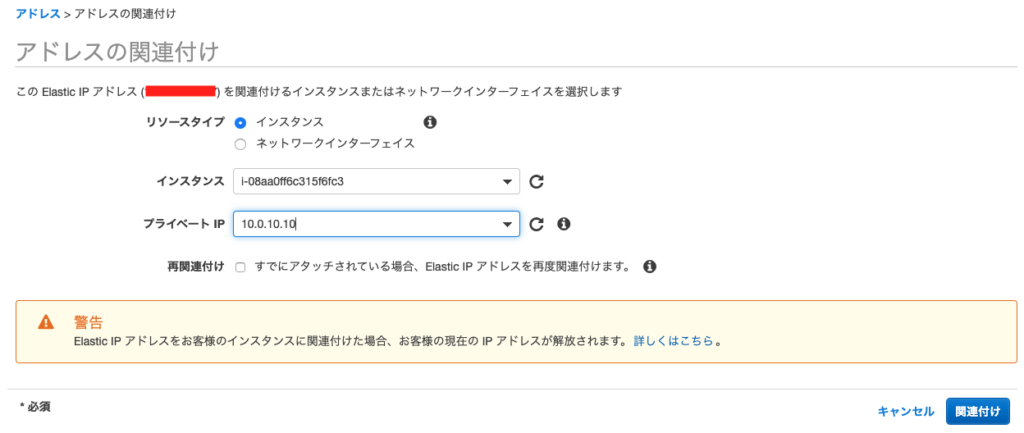 - ElasticIPを指定してアクションのアドレスの関連付けを選択する