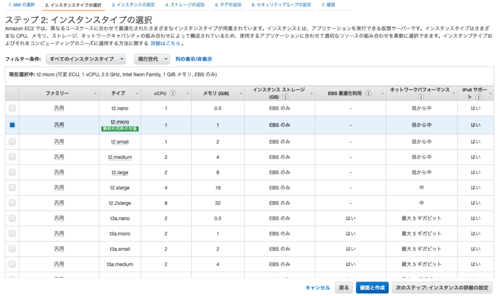 - アクセス数などに応じて必要なスペックのあるインスタンスタイプを選択します。