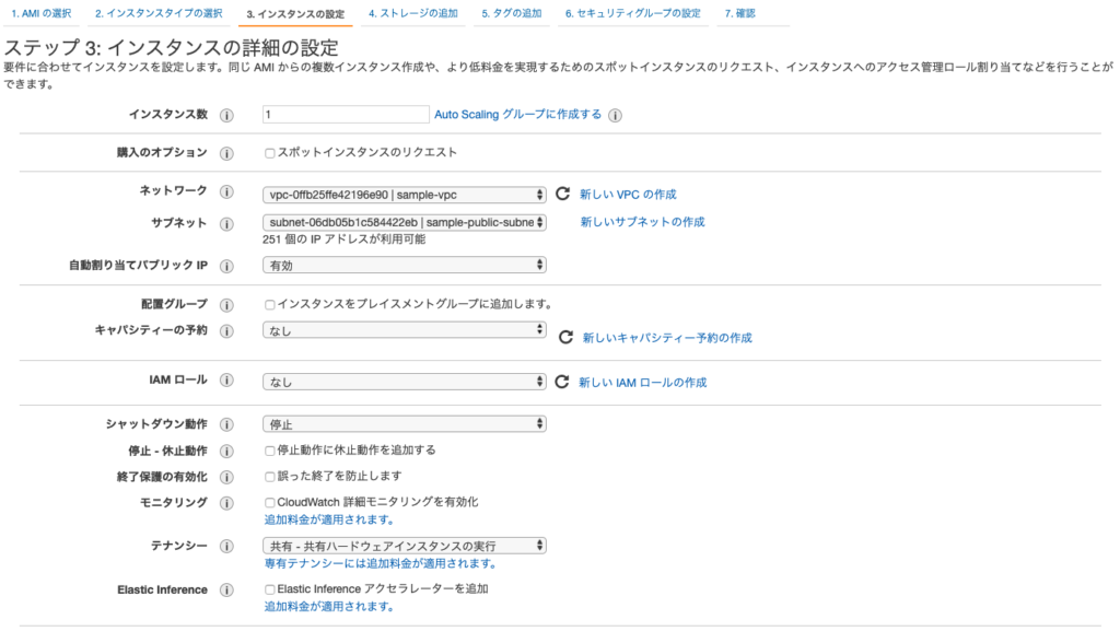 | モニタリング | インスタンスの監視を1分間隔にするかどうか。デフォルトは5分間隔 |