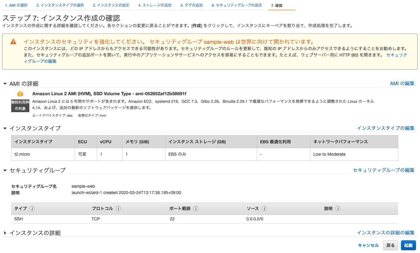 起動を押下するとキーペアの設定モーダルが表示されので新しいキーペアの作成とキーペア名を入力しダウンロードする。その後インスタンスの作成を実行する。