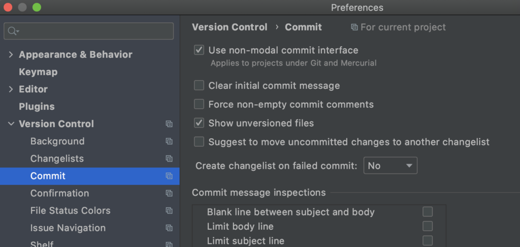 手順はPreferences..→Version Control→Commit→Use non-modal commit interfaceにチェックが入ってると思うのでこれをを外す