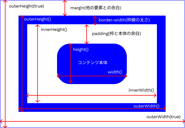 なお、jQueryでは、height,widthメソッドのほかにも、高さ、幅に関する情報を取得するためのメソッドとして、innerHeight/innerWidth, outerHeight/outerWidthなどが用意されている