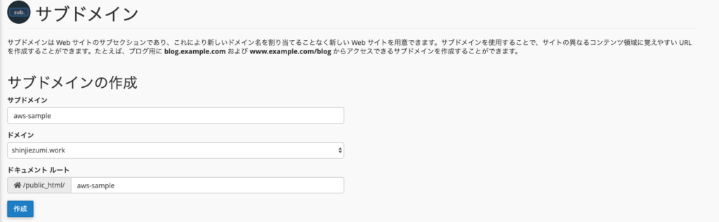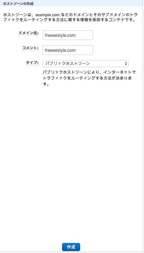 ドメイン名を設定し、タイプはパブリックホストゾーンを選択します。