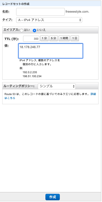 4. Aレコードを追加して値はElasticIPを設定する。レコードセットを作成
